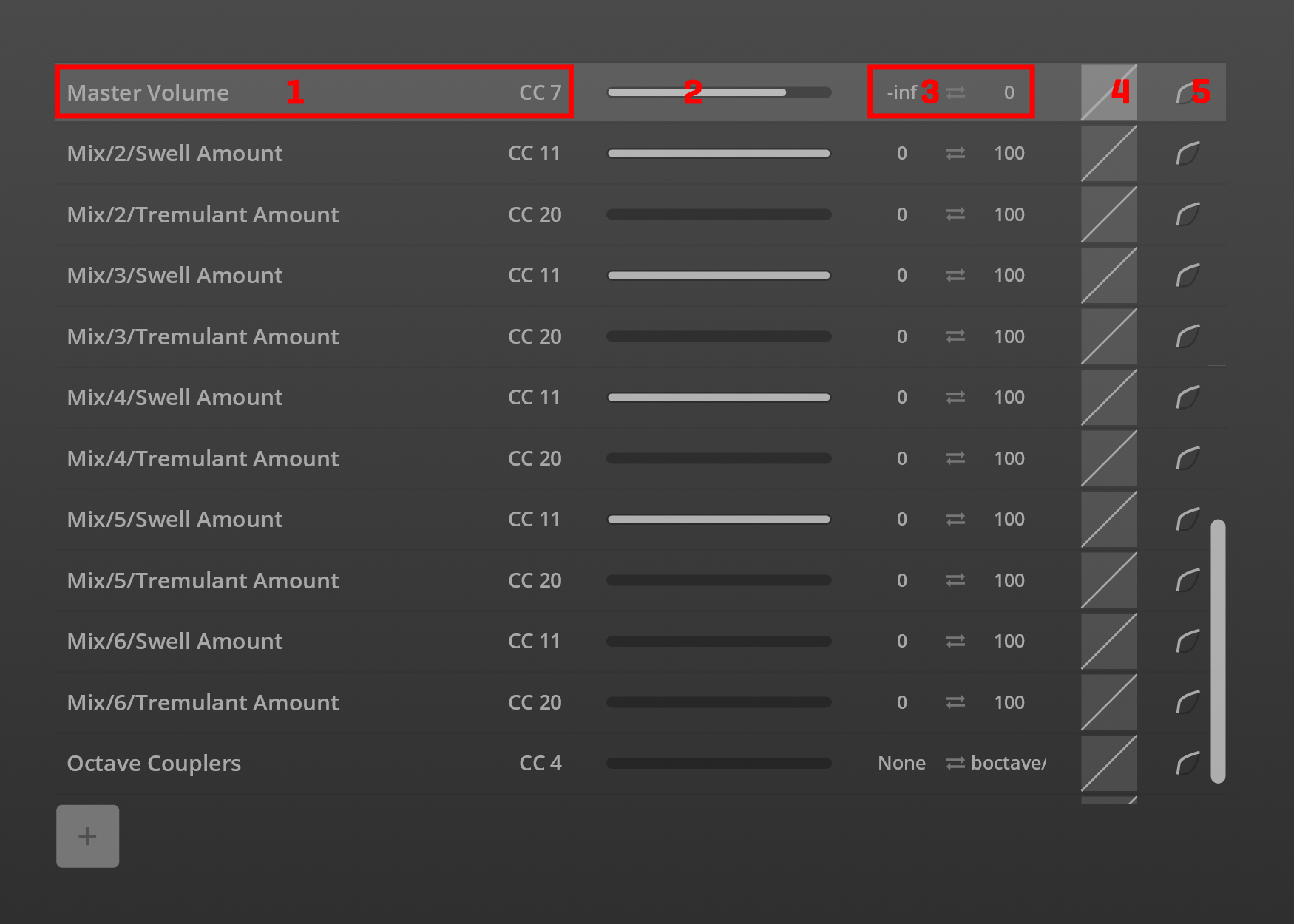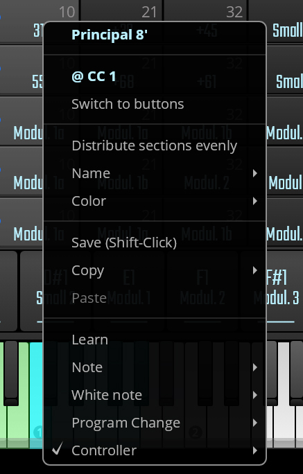 Die Verwendung von MIDI CCs ist z.B. hilfreich bei einem Crescendo-Aufbau, mit dem mittels eines einzelnen Controllers wie dem Modwheel anstatt verschiedenen Tasten Pfeifen hinzugefügt oder weggenommen werden können. Keyswitches hingegen sind besser für abrupte Kombinationswechsel geeignet.Name ermöglicht die Angabe eines vollen Namens sowie einer Abkürzung für die Kombination.