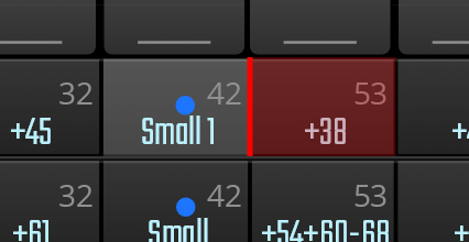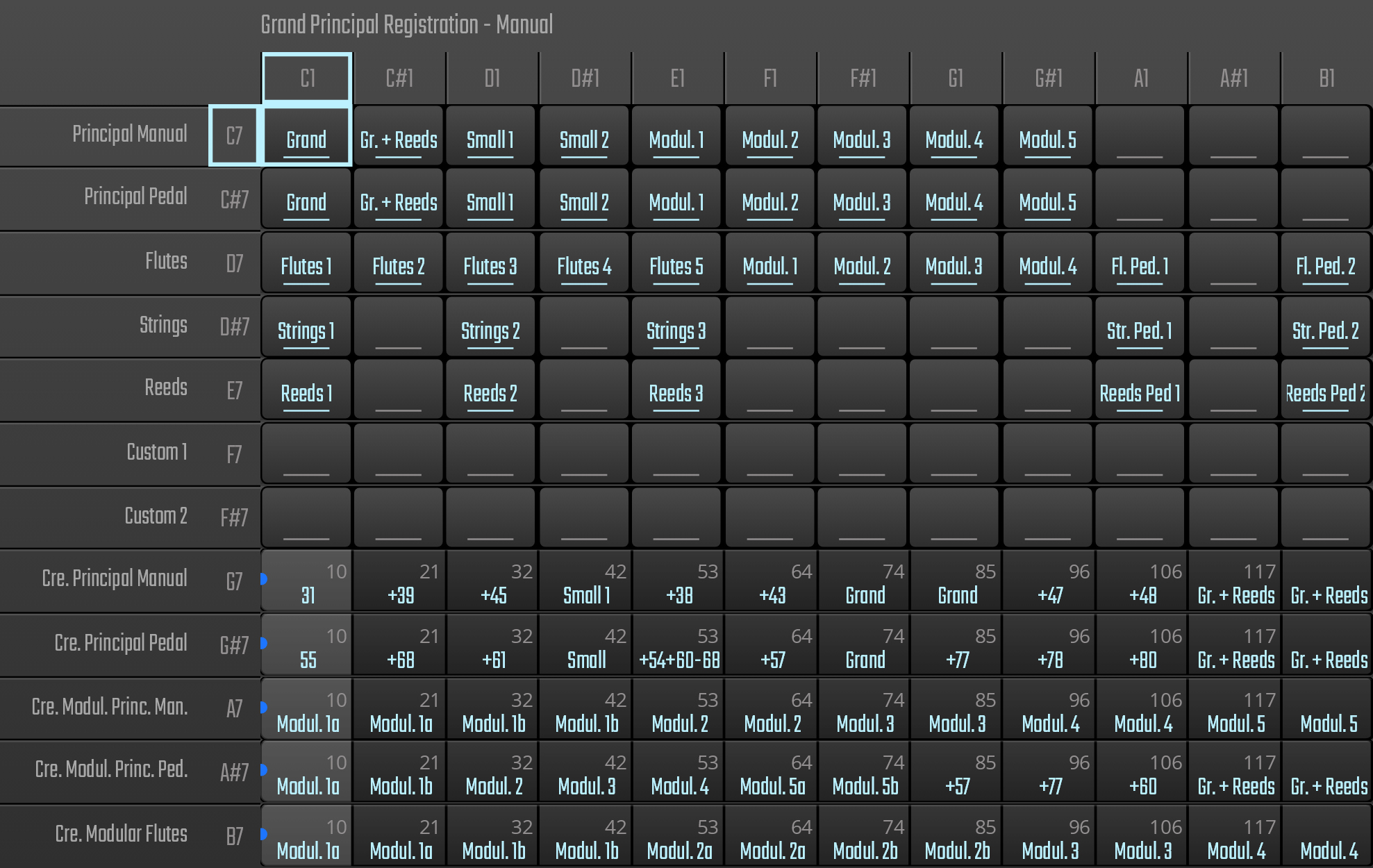 Die horizontalen Reihen des Arrays zeigen den Inhalt der verschiedenen Bänke, die werksmäßig von C7–B7 (regular) bzw. C0–B0 (spread) gemappt sind. Die einzelnen Felder enthalten verschiedene Kombinationen. Ein blauer Punkt zeigt an, dass die Kombinationen mittels CC angewählt werden. Je höher der aktuelle Wert des Controllers, desto weiter nach rechts wandert der Punkt. Banknamen können per Doppelklick geändert werden.