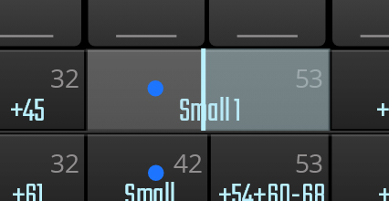 Der Bereich CC-kontrollierter Kombinationsfelder kann durch Ziehen der Grenze zwischen zwei Feldern eingestellt werden. Alt/Option-Klicken auf die Begrenzung zwischen zwei CC-Felder verschmilzt die beiden, wobei die Einstellung des linken Felds erhalten bleibt. Alt/Option-Klicken innerhalb eines Feldes teilt dieses; in diesem Fall haben beide Felder die gleichen Einstellungen, das rechte ist jedoch unbenannt. Eine Bank kann bis zu 12 Felder haben – Felder können also nur geteilt werden, wenn weniger als 12 vorhanden sind.