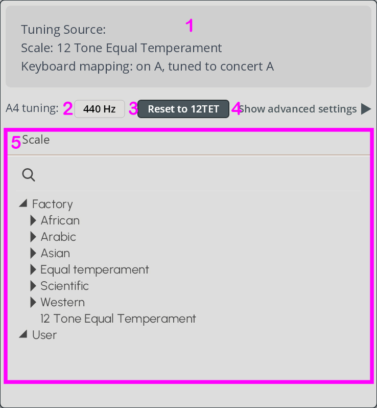 Stimmquelle: Links oben im Tuning-Fenster werden die aktuell gewählte Skala und das zugehörige Keyboard Mapping angezeigt (siehe unten). Ist der Player mit einer externen Stimmquelle verbunden (siehe unten), wird diese Quelle hier angezeigt.
