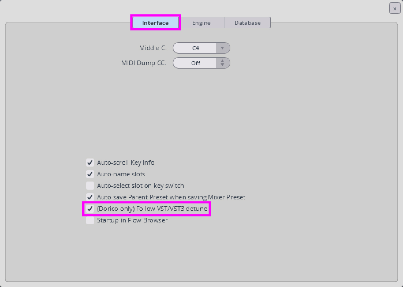 Wird der Player in Dorico als Plugin geladen, ist er automatisch auf den Empfang von VST/VST3 Detune-Informationen gesetzt. Höchstwahrscheinlich werden Sie in Dorico kaum etwas anderes benötigen, weshalb der Button des Tuning Systems in der Menüleiste des Players verborgen ist. Sollten Sie jedoch auf alle Funktionen des Stimmsystems zugreifen wollen, können Sie die Einstellung im Interface Tab der Player-Einstellungen ändern.