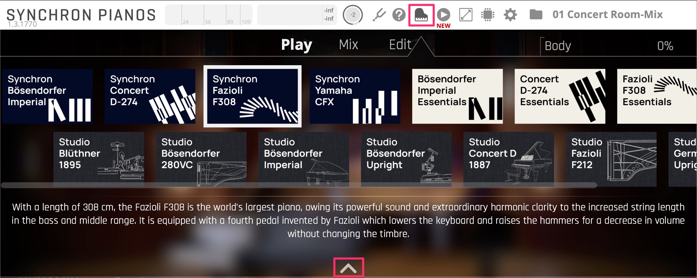 In der Klavierauswahl werden nur Klaviere mit aktiver Lizenz und installiertem Inhalt angezeigt. Wenn Sie das Glück haben, über mehr als eines unserer Synchron-Klaviere zu verfügen, können Sie über das Klaviersymbol oben in der Menüleiste der Synchron Pianos zwischen diesen fantastischen Instrumenten wechseln.