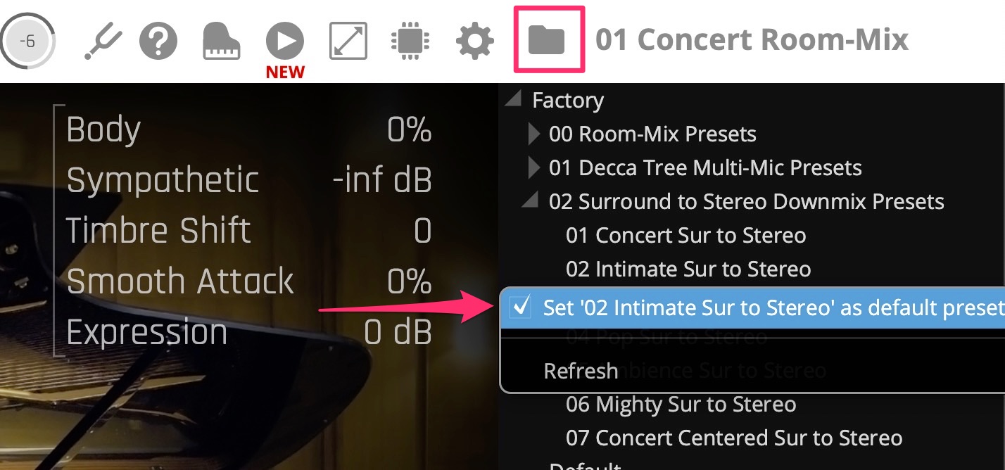 Ist nur ein Klavier lizenziert oder installiert, wird dessen Standard-Preset beim Start automatisch geladen – Sie müssen also kein Preset anklicken, um die Sample-Wiedergabe zu starten. Ihr Standard-Preset wird nur geladen, wenn der entsprechende Inhalt installiert ist.