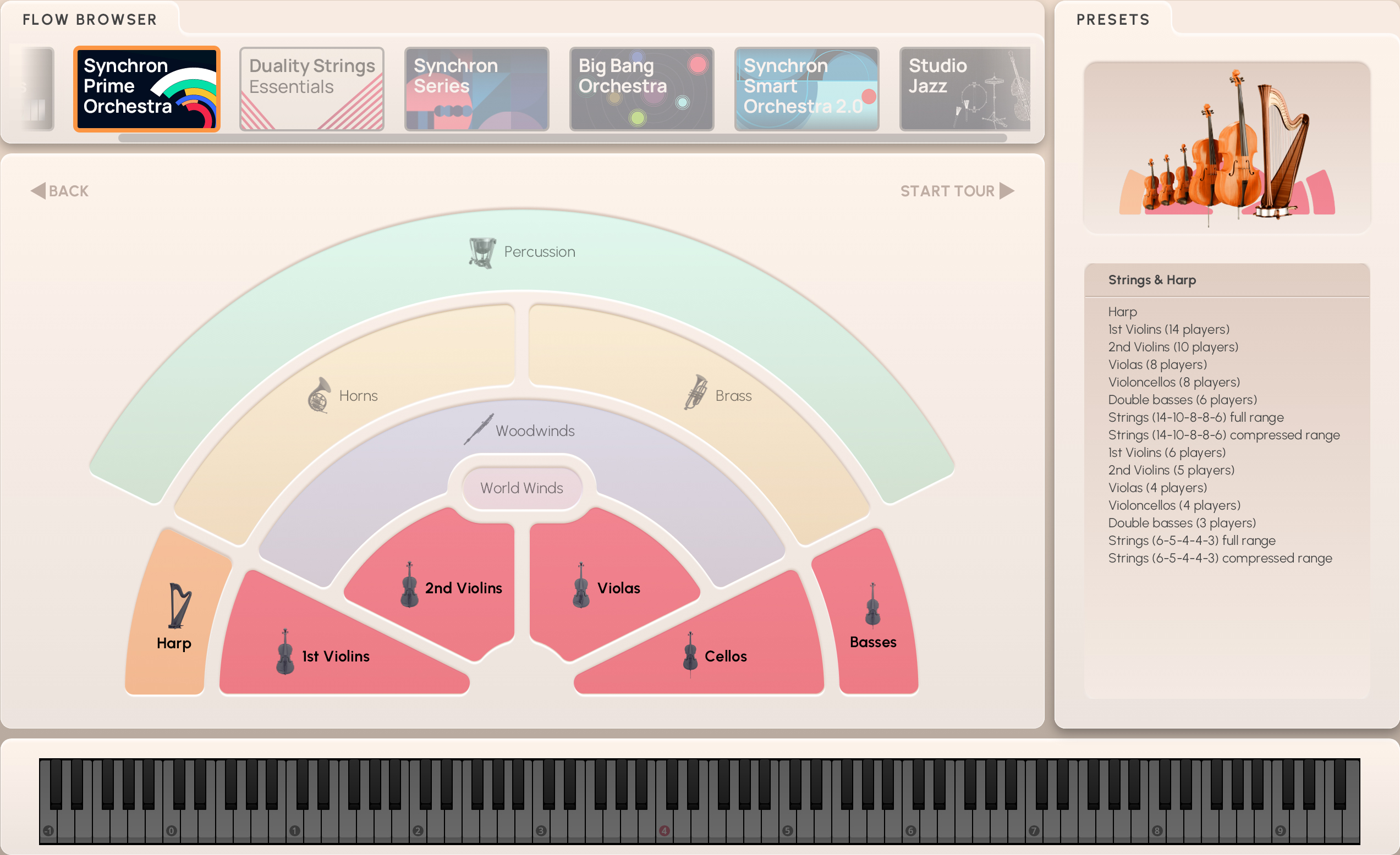 Mit Flow Presets haben Sie direkten Zugriff auf die wichtigsten Parameter eines Instruments, seine Artikulationen und allgemeinen Klangeinstellungen in der Flow-Ansicht des Synchron Players. Die Darstellung ist in diese drei Kategorien eingeteilt; darunter befindet sich die virtuelle Tastatur. Sobald Sie ein Instrument aus der Preset-Liste ausgewählt haben, öffnet sich die Instrumentenansicht.