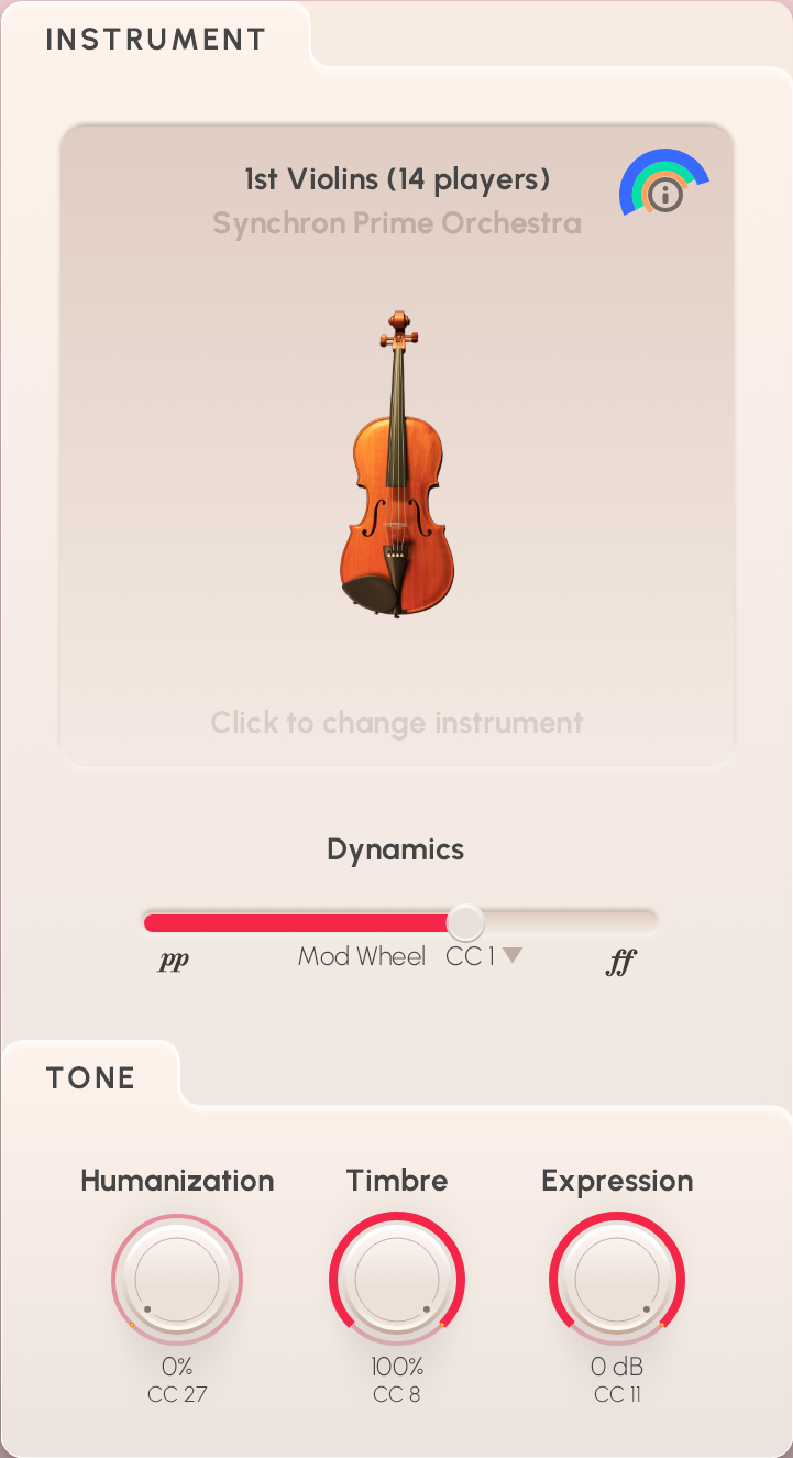 Der Abschnitt Instrument zeigt eine symbolische Darstellung des gewählten Instruments mit dem Preset-Namen als Überschrift. Klicken Sie auf das Feld, um zu einem anderen Instrument zu wechseln. Per Klick auf den Info-Hub rechts oben können Sie die Info-Tour starten oder einen Link zu unserer Instrumentenkunde-Seite Vienna Academy öffnen.