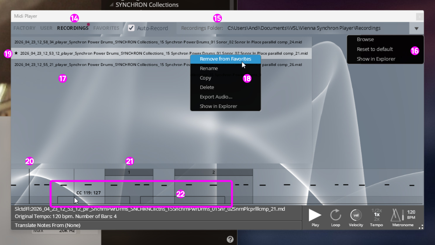 Der MIDI-Player folgt dem Tempo an der aktuellen Songposition in Ihrem Sequenzer. Sie können MIDI-Dateien anpassen, zum Beispiel in Bezug auf Anschlagstärke und Tempo, und sie per Drag-and-drop in Ihren Sequenzer importieren.