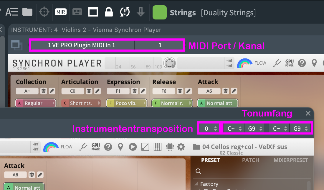 Jeder Input wird ganz oben in jedem Kanal angezeigt. Bei Synchron-Instrumenten wird auch die aktuelle Artikulation ausgegeben. Diese Inputkanäle und Plugins können jederzeit beliebig gewechselt werden.