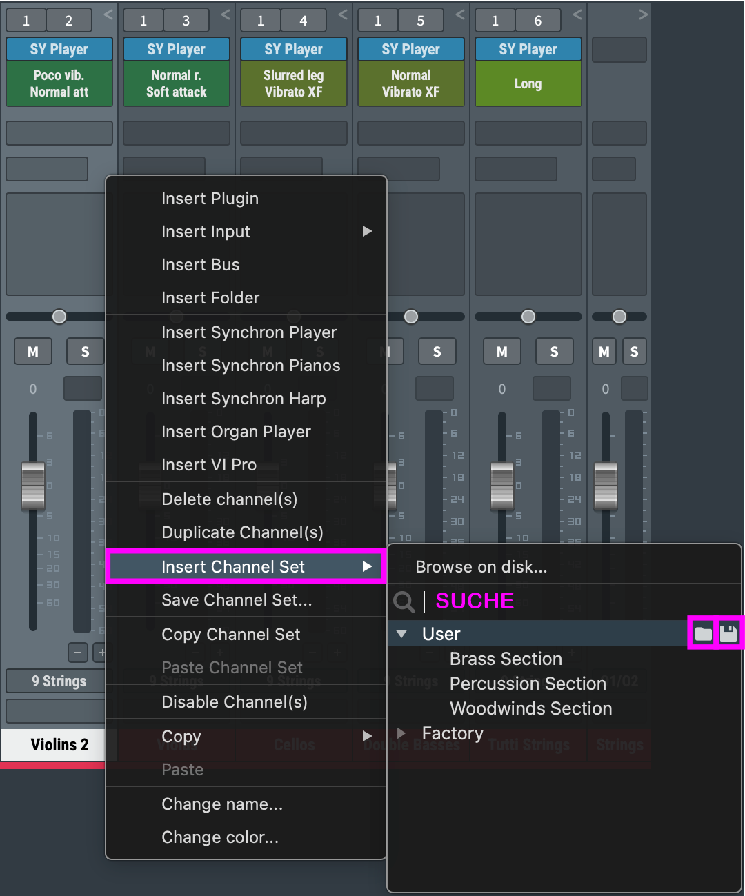 Zum Einfügen eines bestehenden Channel Sets wählen Sie den Kanal aus, nach dem es eingefügt werden soll, und wählen Sie das gewünschte Set per Rechts-Klick. Auch hier können Sie bei langen Listen nach Namen suchen. Befindet sich der Mauszeiger über einem User Set, werden auch Optionen angezeigt, das Set mit einer neuen Kanalauswahl zu überschreiben oder es zu löschen.