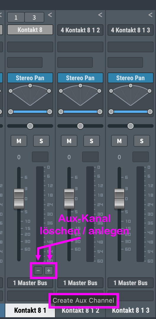 Wenn Sie in Ihrer Arbeit multitimbrale Plugins wie Vienna Instruments Pro, Omnisphere oder Kontakt verwenden, können sie die verfügbaren Ausgänge dieser Plugins bequem als eigenständige Eingangskanäle hinzufügen bzw. entfernen, indem Sie auf die "+/–"-Buttons unter dem Lautstärkeregler der Instrumentenspur klicken.