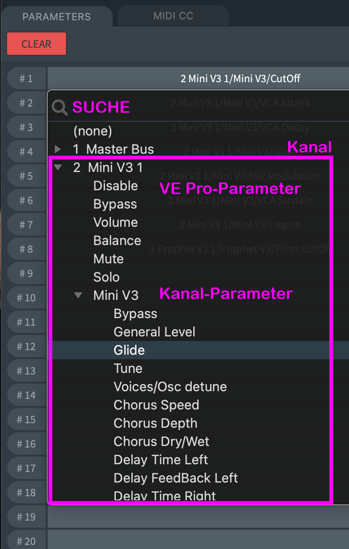 Fügen Sie einen neuen Eintrag hinzu und wählen Sie den Automations-Parameter oder MIDI CC der Automation. Sie können Automationsquelle und -ziel aus einer Liste auswählen oder die "Learn" [L]-Buttons verwenden, um einen Controller in Ihren Plugins oder Kanälen zu selektieren. Clear entfernt alle Einträge des Automation Mappings.