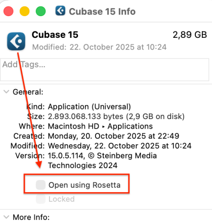 Wenn Sie auf einem Apple Silicon Rechner arbeiten, überprüfen Sie, ob Sie bereits ohne Rosetta Mode arbeiten. Per Rechtsklick auf die Anwendung können Sie zusätzliche Informationen anzeigen lassen. Im Silicon Native Mode (Rosetta Mode NICHT aktiv) wird eine bessere Performance erzielt.