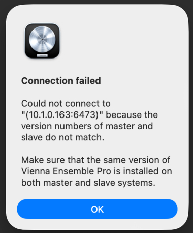 Fehlermeldungen bei der Verbindung: Wenn Sie eine dieser Fehlermeldungen sehen, versuchen Sie gerade, sich mit einem Vienna Ensemble Pro Server zu verbinden, dessen Version nicht mit der Vienna Ensemble Pro Plugins in Ihrem Sequenzer übereinstimmt.