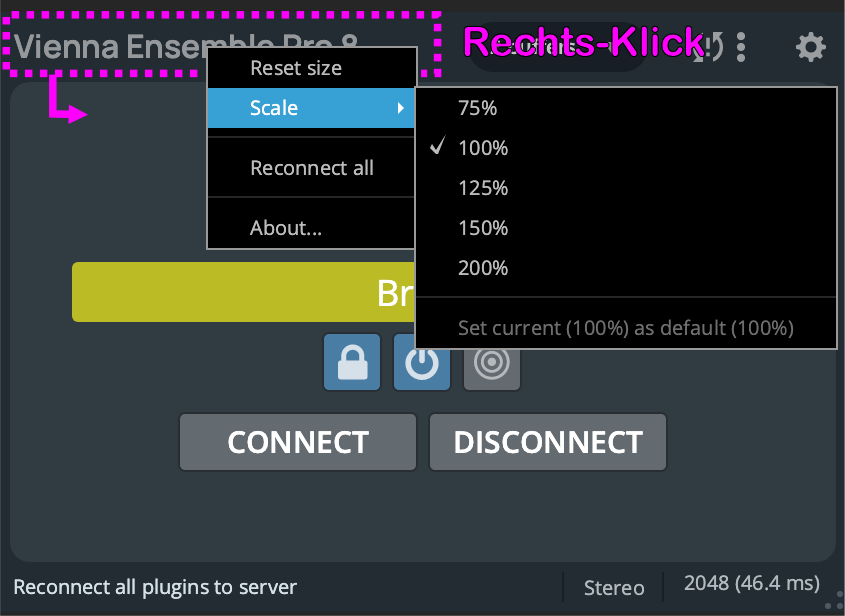 Ein Rechtsklick in die Menüleiste öffnet ein weiteres Kontextmenü mit Skalierungsoptionen und der praktischen Funktion Reconnect all zur erneuten Verbindung aller Instanzen.