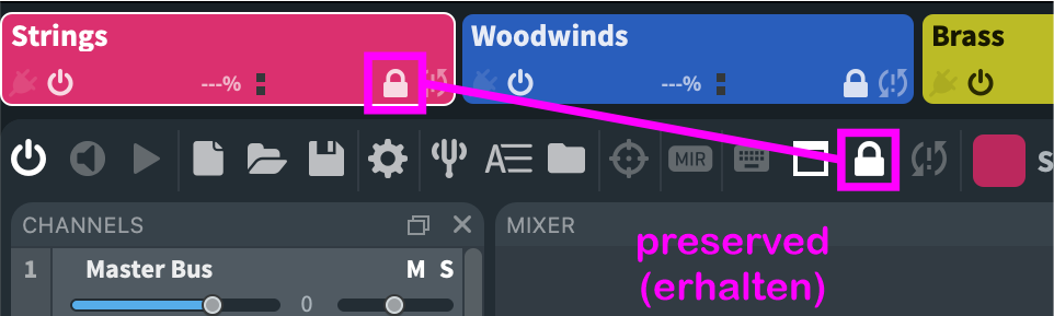 Sobald eine Instanz auf diese Weise erzeugt wird, ist sie automatisch preserved (erkennbar an dem aktivierten Schloss-Symbol) – die Instanz bleibt mit allen Plugins erhalten, auch wenn sie nicht mehr mit einem Sequencer verbunden ist.