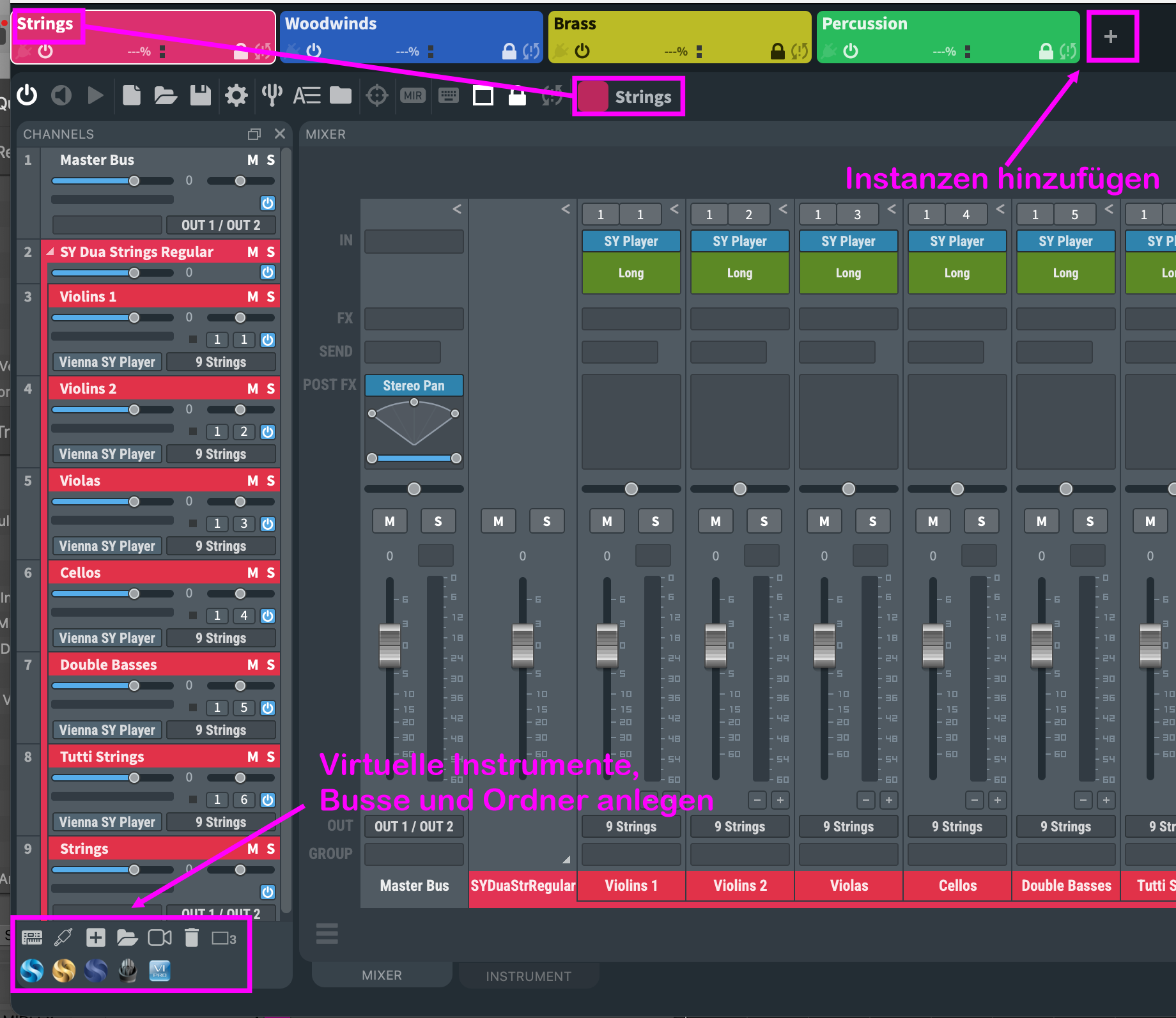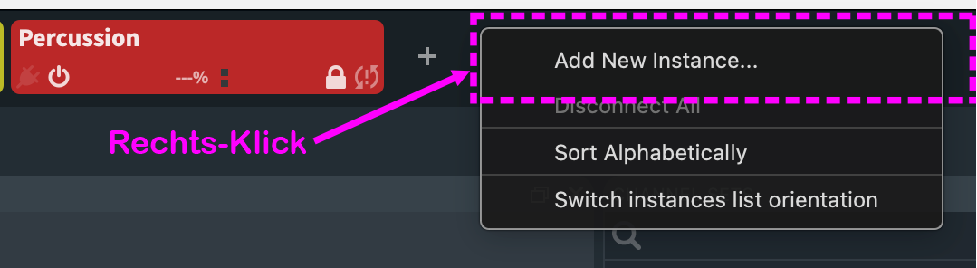 Mit Hilfe des Instrumentenmenüs in der linken unteren Ecke können Sie jetzt weitere Instanzen hinzufügen, Instrumenten-Plugins laden etc.
