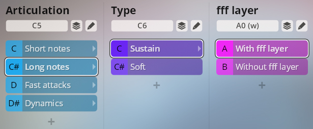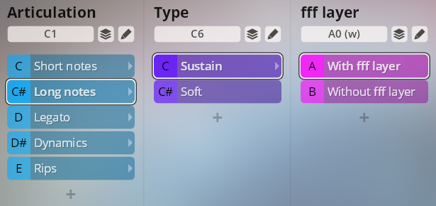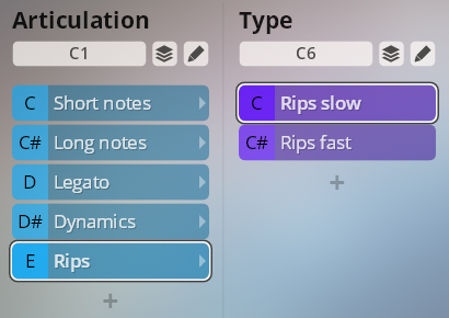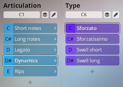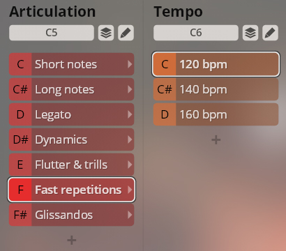 The basic cluster articulations are the same as the regular ones, but without contrabass tuba variants, and instead of the legato section (which doesn’t make much sense with clusters) there is a duplicate of the long notes. You can switch between the articulations of different presets without having to adapt any keyswitches. The upper range of cluster articulations is a whole tone lower than regular ones, as the two highest notes are always part of a cluster.