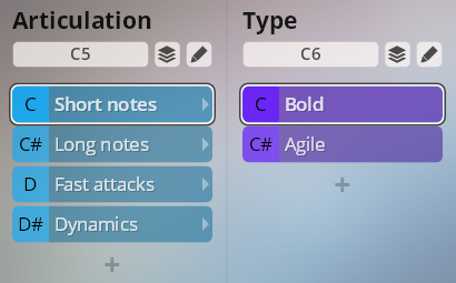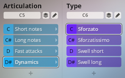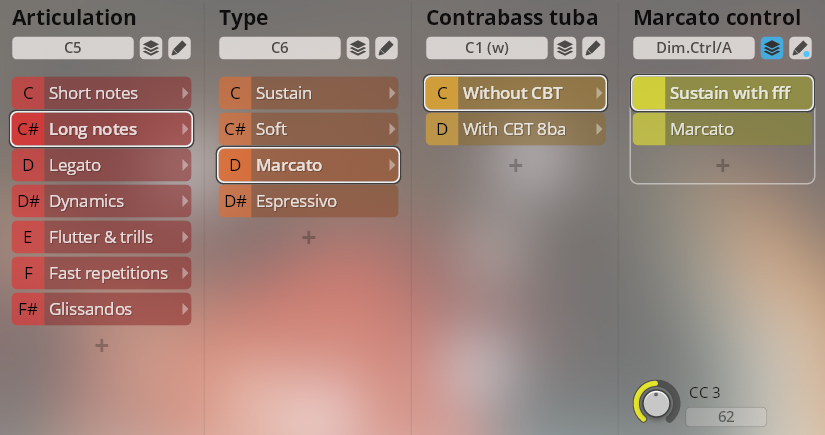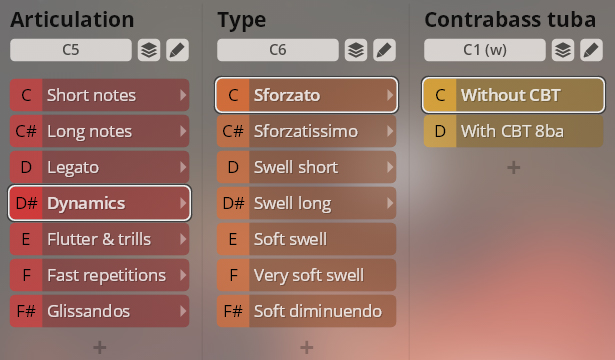 The Preset's basic articulations can be changed with keyswitches from C5 to F#5, and the keyswitches for these articulations' types start at C6. For some Types, there are variants with and without contrabass tuba.