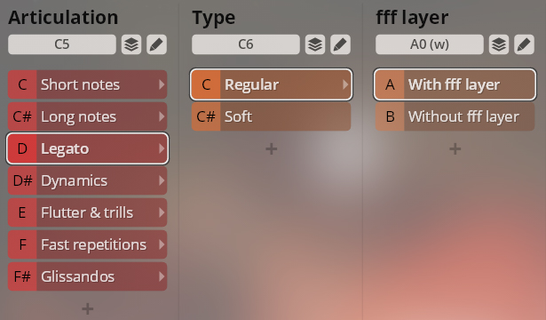 Regular sustains/legato with and without fortissimo layer; soft sustains/legato.