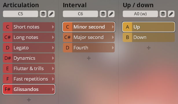 Glissandos, minor and major second, and fourth, up and down. Please note that the actual playing range is diminished by the glissando interval – for instance, minor 2nd upward glissandos can only be played up to D#4 where E4 is the target note, downward ones down to G#1 where G1 is the target note.