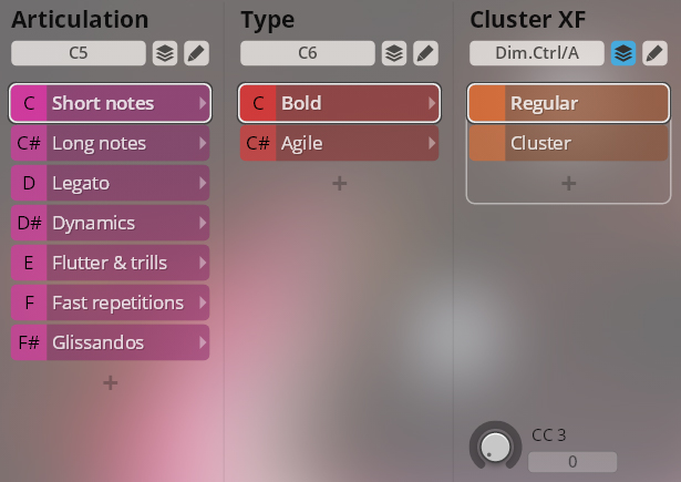 This combined preset offers an additional Dimension for crossfading between regular and cluster articulations with the help of MIDI CC 3, so that you can determine the strength of cluster tones added to the base note. Apart from that, the preset has the same layout as the Low Brass preset, but without the contrabass tuba option.
