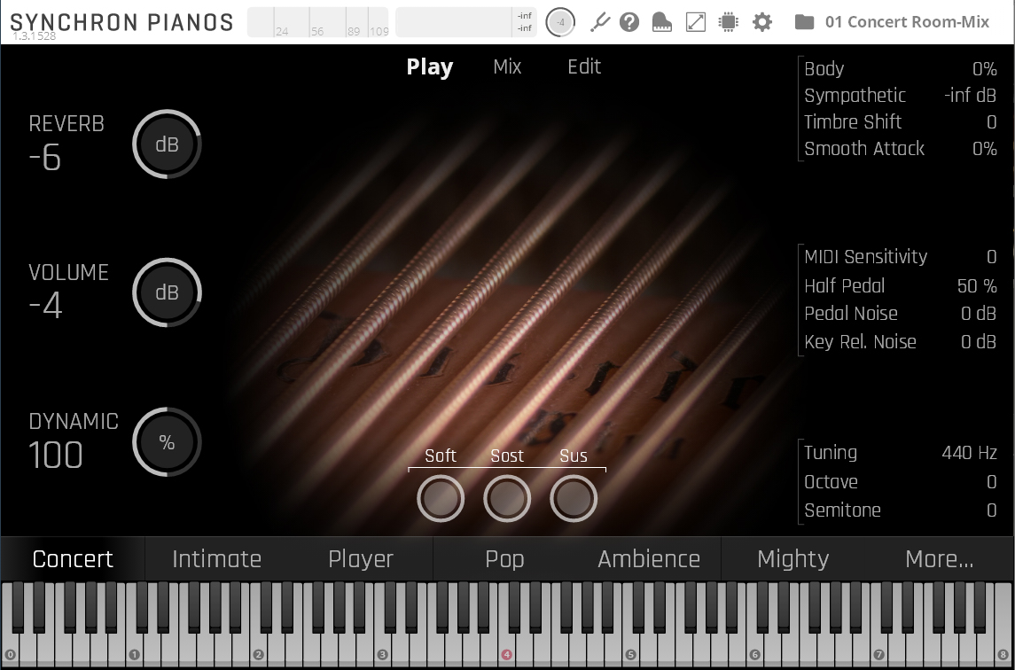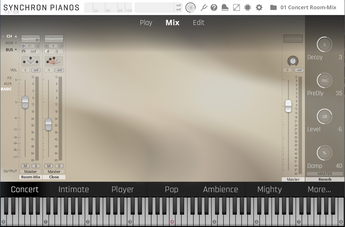 In the browser window of the Synchron Pianos player you may select from seven pre-configured Character Presets of the Room-Mix category. The "Room Mix" channel contains a mix of all available microphones from the Full Library, while the "Close" channel implements the intimate close microphone position.