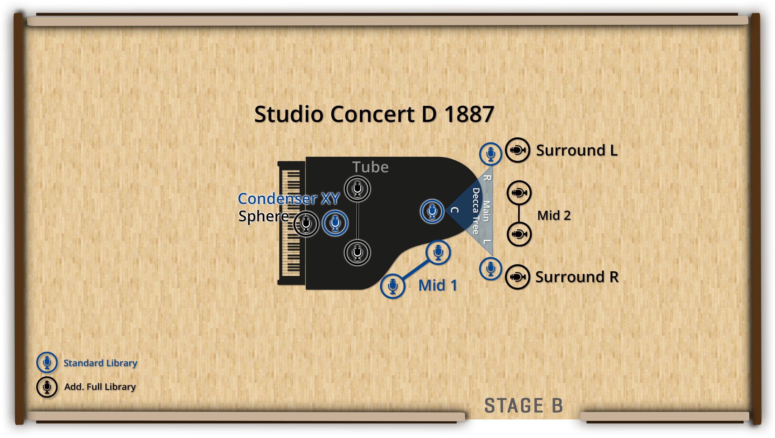 In order to capture this instrument on Stage B, our recording engineers used multiple high-end microphone arrays, affording an abundance of options for creating your individual sound. The Full Library features 8 microphone positions – three different sets of close microphones with condenser, ribbon and tube options, two pairs of mid mics, as well as the Decca tree with additional surround outriggers.