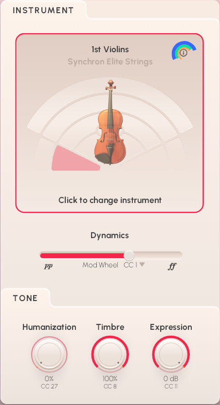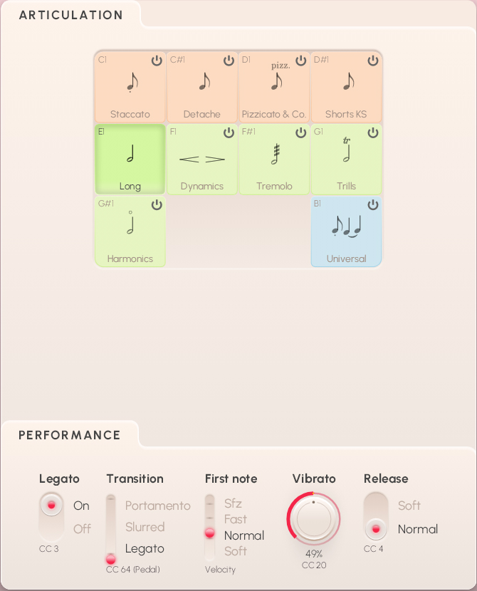 Some atriculations feature a Vibrato fader knob assigned to MIDI CC20, allowing you to “soft-switch” with a narrow crossfade area between samples without and with vibrato.