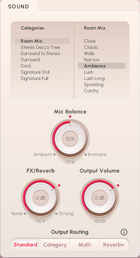 Finally, there is the choice of Output Routing represented by the four buttons Standard, Category, Multi, and Reverb+:
