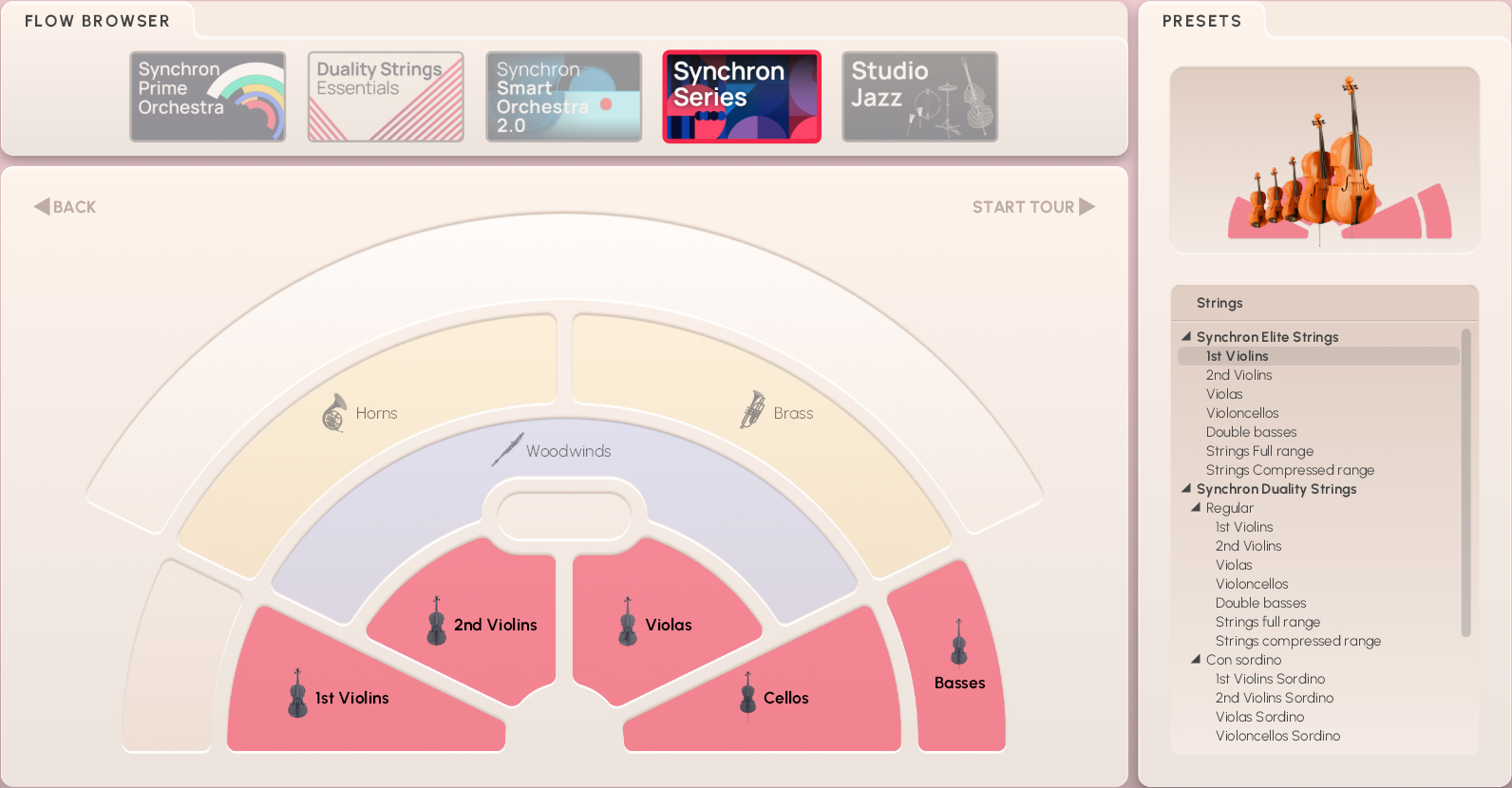 Flow Presets give you instant access to the most important parameters of an instrument, its articulations, and general sound settings in the Synchron Player’s Flow view. The display is subdivided accordingly, with the graphic keyboard underneath. On the Flow Browser page, you can click on “Start Tour” to step through explanations of the different Flow elements and parameters. Alteratively, you can click on the Info Hub icon in the upper right corner of the instrument pane, where you can start the tour or connect to our online instrument academy.