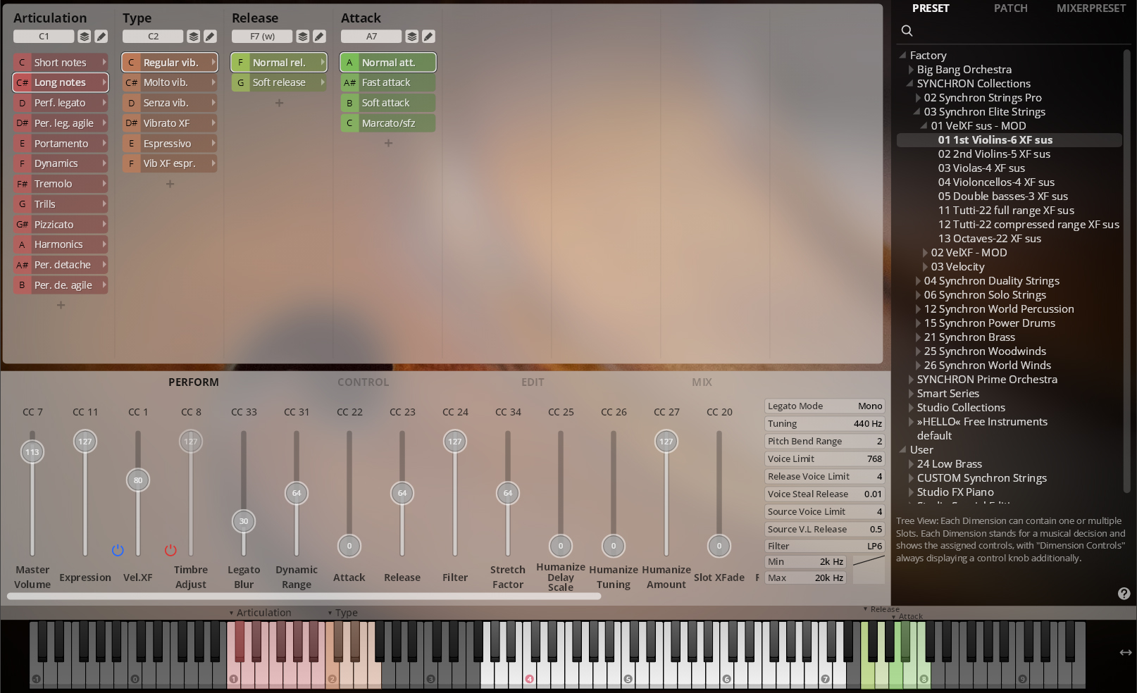 The Articulation pane holds all the samples, so to speak. In the upper field, you see the possible choices with their keyswitches, which are also marked on the Synchron Player’s virtual keyboard. Of course, you can also click on a button to switch to that articulaton. The articulation buttons are color-coded: orange for short notes, green for long ones, and blue for the Universal articulation that allows you to perform without keyswitching.