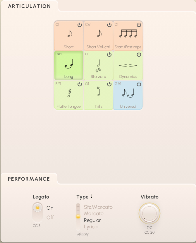 Some instruments feature a Vibrato fader knob assigned to MIDI CC20, allowing you to “soft-switch” with a narrow crossfade area between samples without and with vibrato.