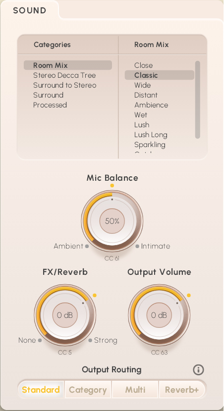 Finally, there is the choice of Output Routing represented by the four buttons Standard, Category, Multi, and Reverb+:
