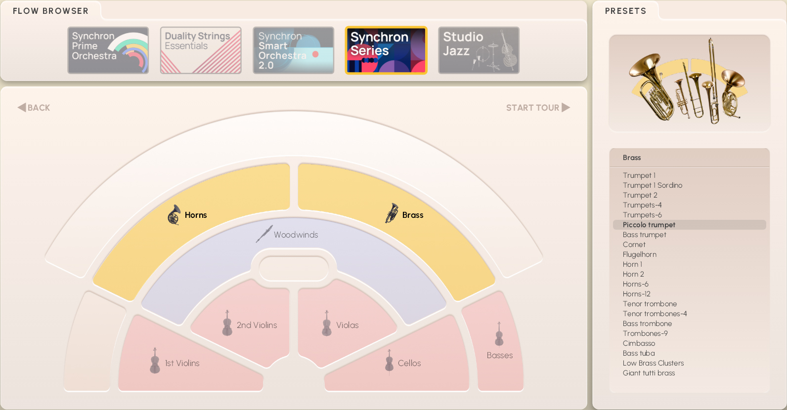 Flow Presets give you instant access to the most important parameters of an instrument, its articulations, and general sound settings in the Synchron Player’s Flow view. The display is subdivided accordingly, with the graphic keyboard underneath. On the Flow Browser page, you can click on START TOUR to step through explanations of the different Flow elements and parameters as shown below.