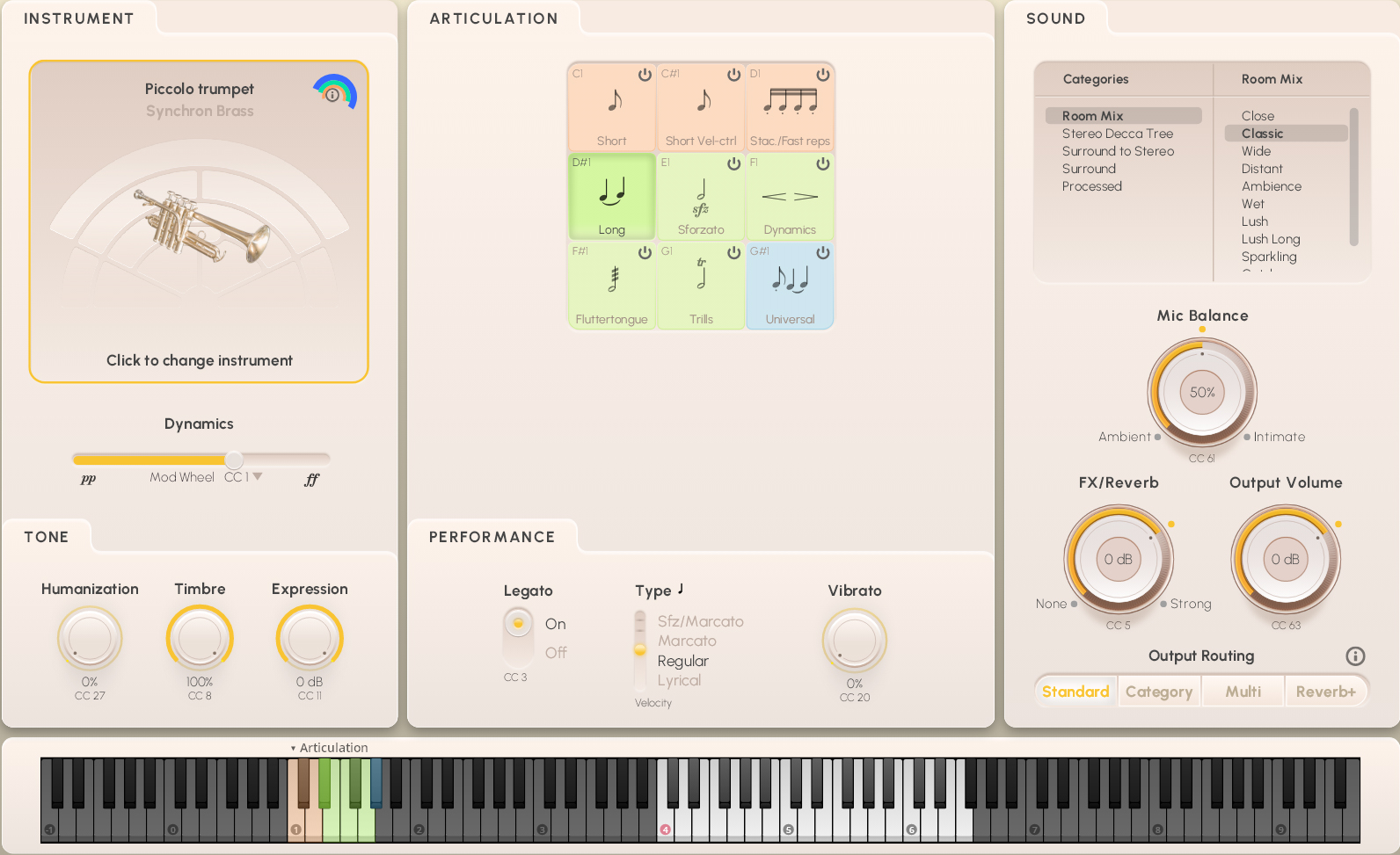 The Articulation pane holds all the samples, so to speak. In the upper field, you see the possible choices with their keyswitches, which are also marked on the Synchron Player’s virtual keyboard. Of course, you can also click on a button to switch to that articulaton. The articulation buttons are color-coded: orange for short notes, green for long ones, and blue for the Universal articulation that allows you to perform without keyswitching.