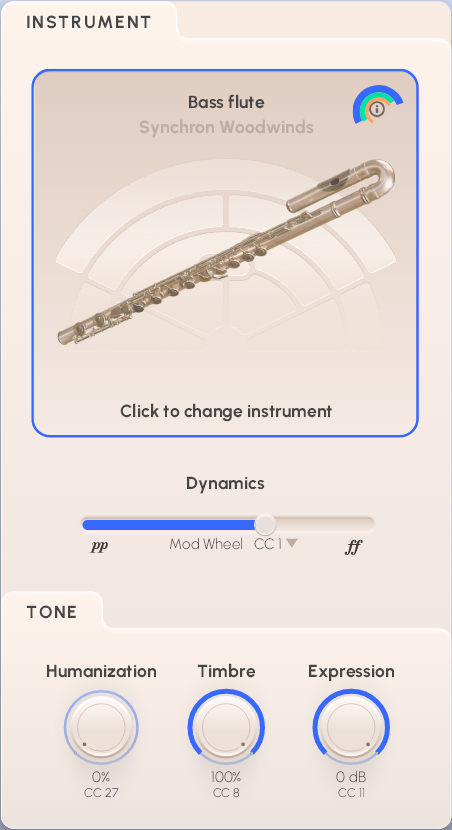 The instruments of Synchron Special Woodwinds provide two different kinds of Presets, accessible by clicking on the icons “Flow” resp. “Precision” in the Synchron Player’s top bar. Flow Presets offer an intuitive, graphic approach to the library’s contents, with instrument, articulation, and sound parameters displayed in a single window.