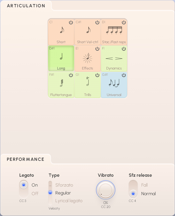 Some instruments feature a Vibrato fader knob assigned to MIDI CC20, allowing you to “soft-switch” with a narrow crossfade area between samples without and with vibrato.