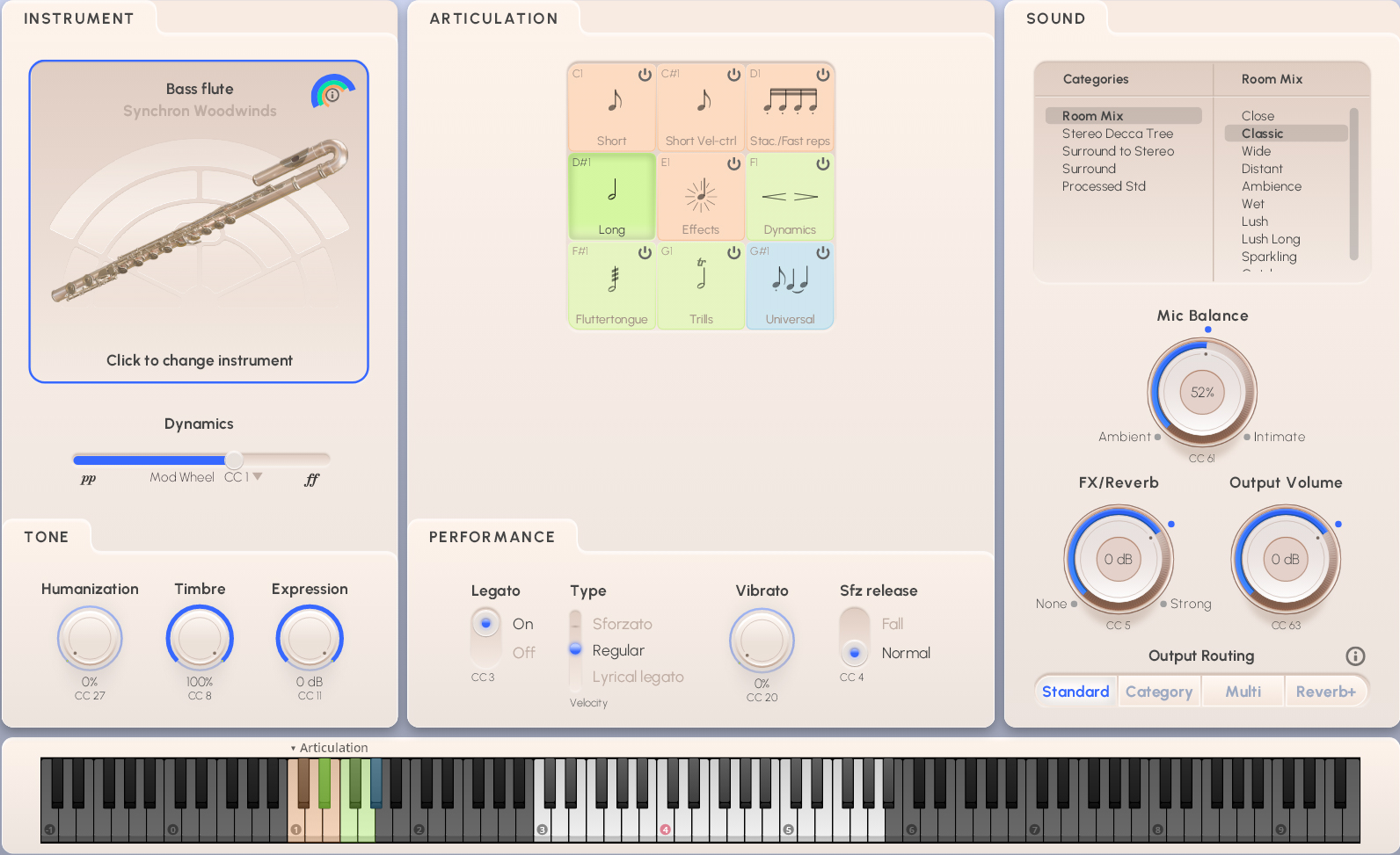 Type control for other articulations is mostly set to keystroke velocity, or to keyswitches as with the bass flute’s effects.