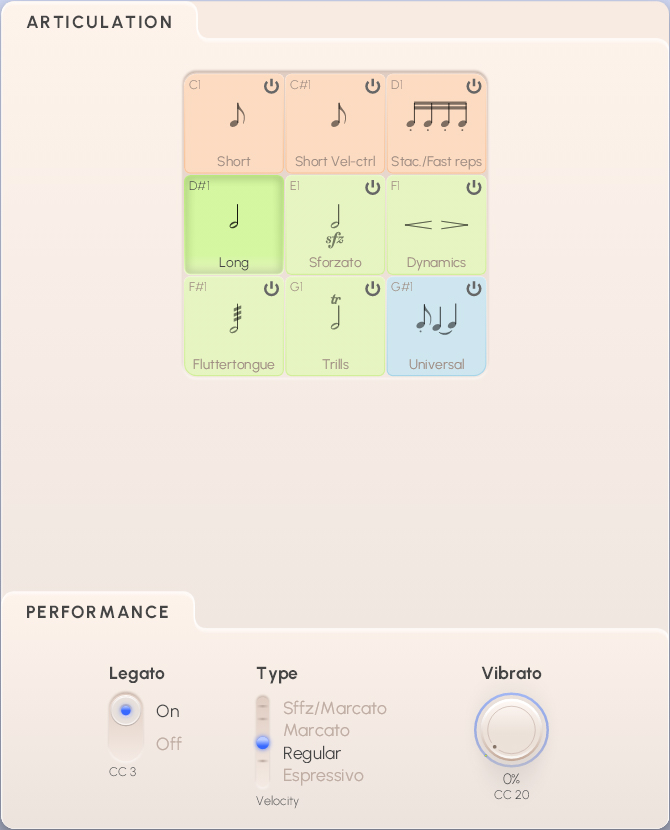 Some instruments feature a Vibrato fader knob assigned to MIDI CC20, allowing you to “soft-switch” with a narrow crossfade area between samples without and with vibrato.