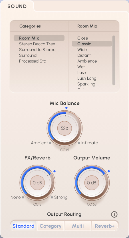 Finally, there is the choice of Output Routing represented by the four buttons Standard, Category, Multi, and Reverb+: