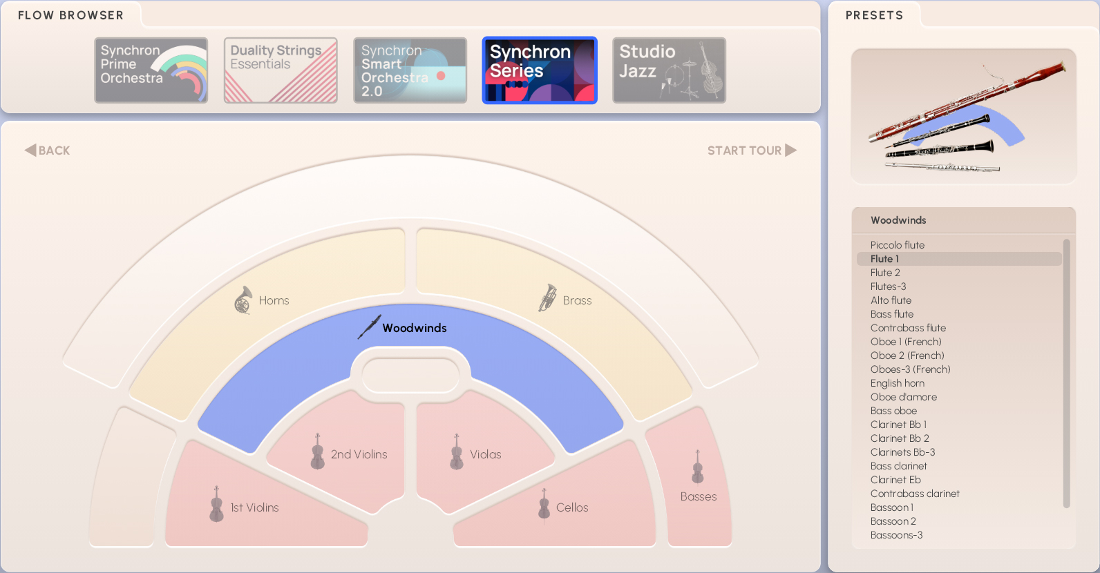 As mentioned above, Flow Presets give you instant access to the most important parameters of an instrument, its articulations, and general sound settings in the Synchron Player’s Flow view. The display is subdivided accordingly, with the graphic keyboard underneath. On the Flow Browser page, you can click on START TOUR to step through explanations of the different Flow elements and parameters.