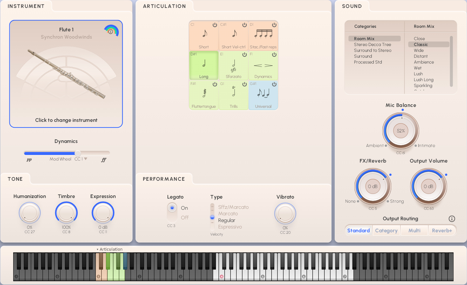 The instruments of Synchron Woodwinds provide two different kinds of Presets, accessible by clicking on the icons “Flow” resp. “Precision” in the Synchron Player’s top bar. Flow Presets offer an intuitive, graphic approach to the library’s contents, with instrument, articulation, and sound parameters displayed in a single window.