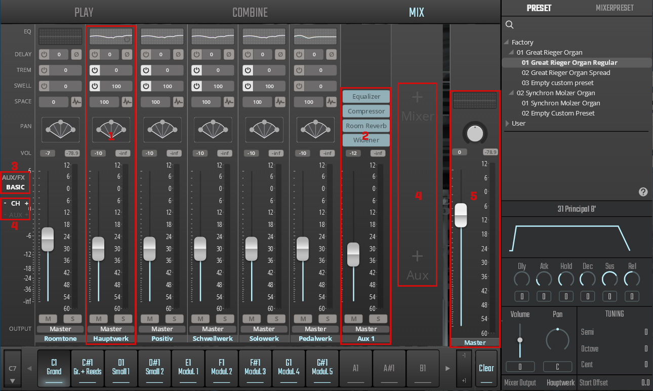 The MIX tab hosts the Vienna Organ Player's audio routing. Each of the manuals and the pedal have dedicated audio channels, which you can configure to suit your requirements.