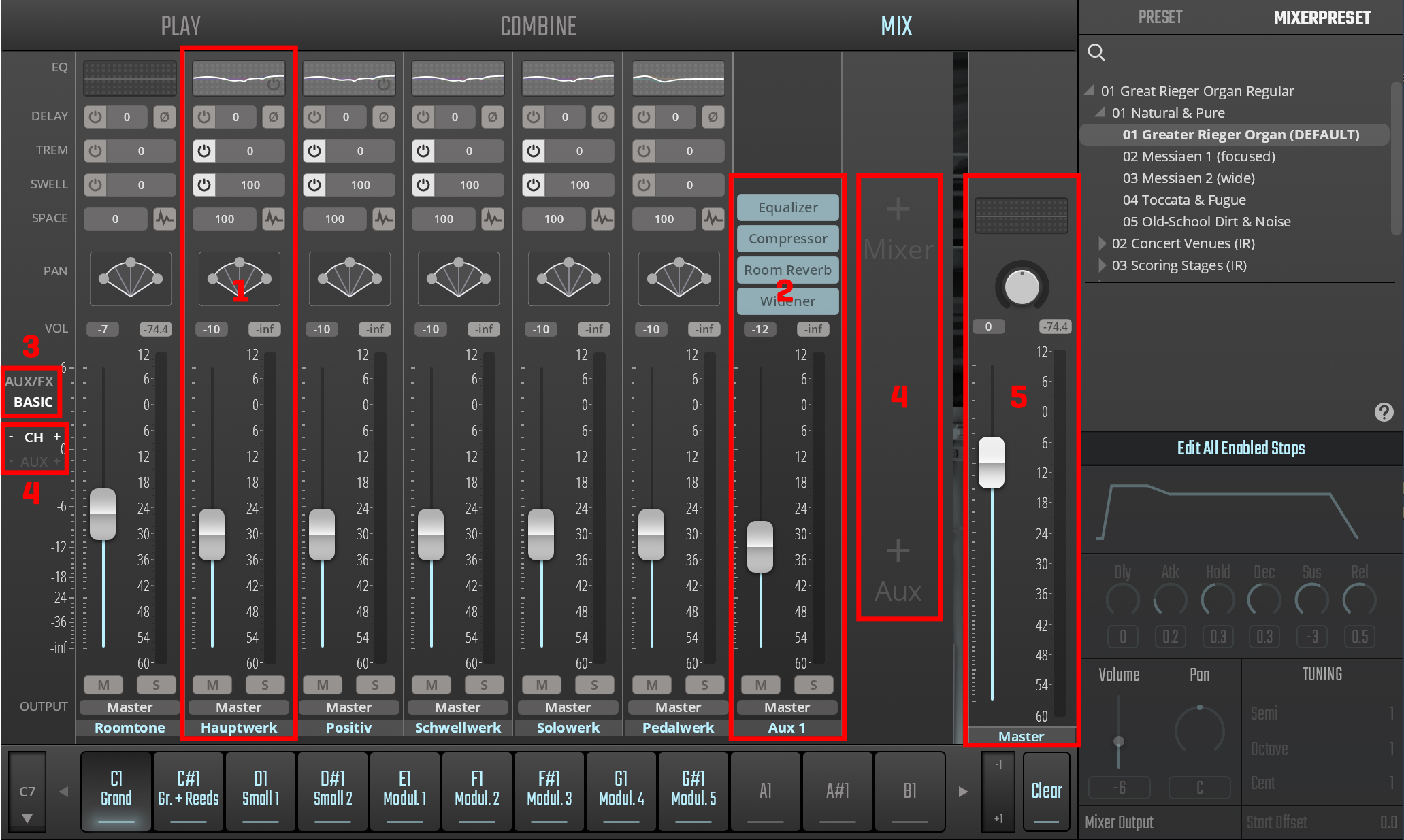 Great Rieger Organ: Each of the manuals and the pedal as well as the room tone have dedicated audio channels, which you can configure to suit your requirements.