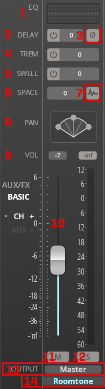 As customary, the lower half of a channel shows the volume meter, mute and solo buttons, channel output, and its name. In the upper half, you will find different parameters according to whether you're in the BASIC or AUX/FX view.