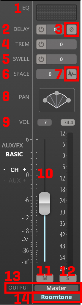 Mute: Mutes the selected channel. Turns red when muted.