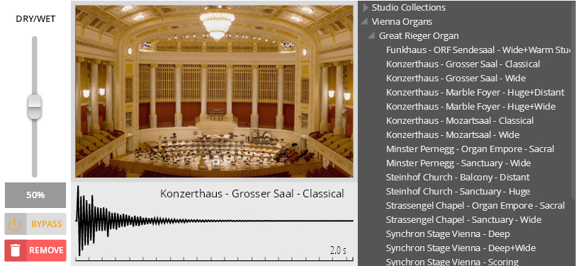 IR: Clicking on the wave icon opens the impulse reverb editing window, and allows you to add a convolution impulse response to the channel. There are dedicated IRs only for the Great Rieger Organ, but of course, one can try them on another organ, too, and see what happens.