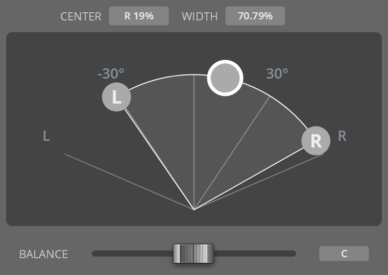 Balance panning allows values between 0 and 1, with 0.5 as the center position. You can drag the panner, double-click to enter a numerical value, or Cmd/Ctrl-click to reset it to the center position. Power panning lets you define individual values for the signal width and center position. Naturally, the latter can only be changed if the signal width is less than 100%. Drag the handles to adjust width and center, or enter values in the respective fields.