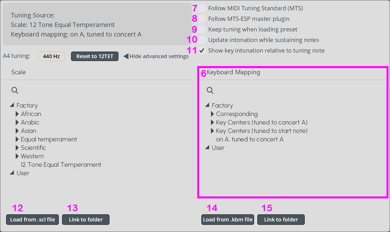 / 15. Link to folder: you can specify a folder on your local file system which contains your personal .scl/.kbm files. Those files will be displayed in the “User” section of the browser. Attention: For responsiveness reasons, only the first 200 files will be displayed!