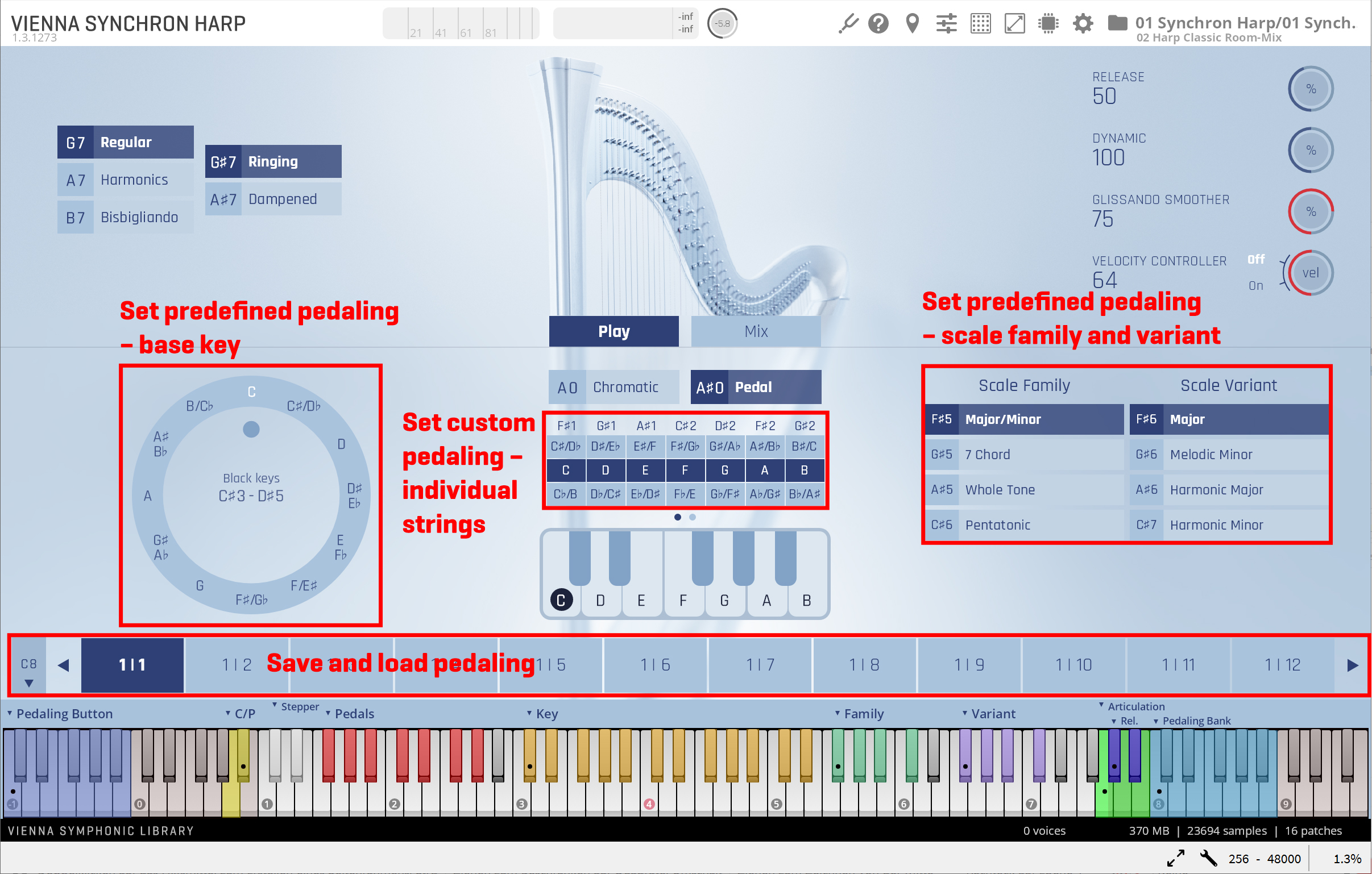 As Chromatic mode shares the few options it has (Articulation choice and Mode switching) with Pedal mode, these will also be covered in this section. The Play view has four main sections: the menu bar on top, the harp area (whose upper half features tonal parameters and the lower half contains all the settings you need for playing), the virtual keyboard showing the play area and keyswitches, and the info bar.