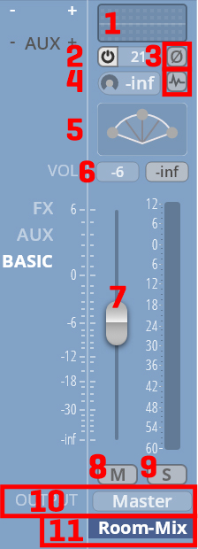As customary, the lower half of a channel shows the volume meter, mute and solo buttons, channel output, and its name. In the upper half, you will find different parameters according to whether you’re in BASIC, AUX, or FX view.